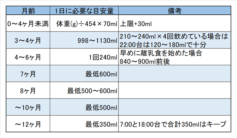 - 月齢ごとの授乳量の目安